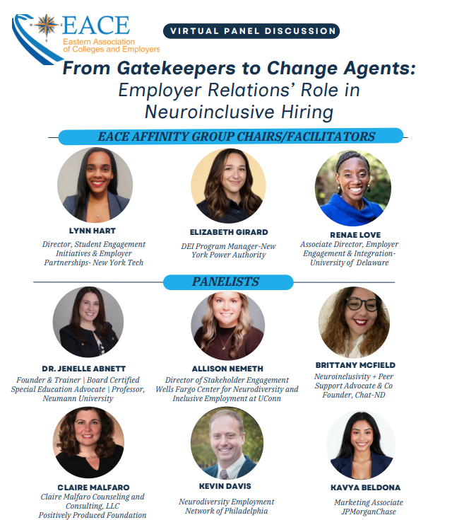 Employer Relations Professionals & Neurodiversity Affinity Group MeetingFrom Gatekeepers to Change Agents: Employer Relations’ Role in Neuroinclusive HiringFriday, February 27, 202612:00 pm - 1:00 pmThis 60-minute interactive session is designed for Employer Relations and Career Services professionals and will focus on practical ways ER teams can influence more neuroinclusive hiring practices — from employer preparation through interview processes and partnership conversations. We’ll be joined by a cross-sector panel of practitioners and advocates, including representatives from the Wells Fargo Center for Neurodiversity and Inclusive Employment at UConn, EPIC EB Consulting Group, Chat-ND, Claire Malfaro Counseling & Consulting, and Dr. Jenelle Abnett, Board Certified Special Education Advocate and trainer.